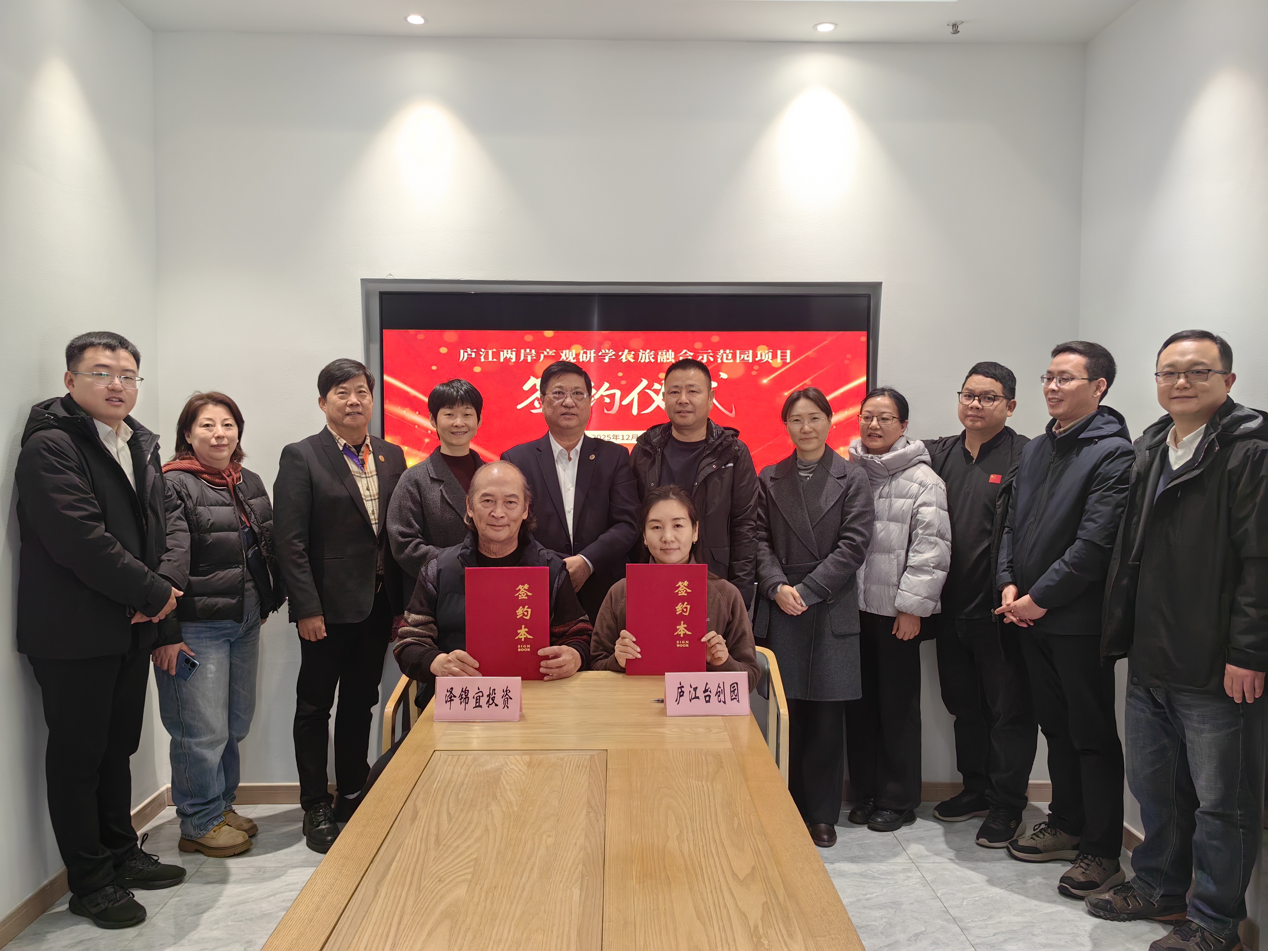 12月25日上午,庐江两岸产观研学农旅融合示范园项目正式签约。全国台企联常务副会长陈锦龙,庐江县政府副县长周蓓,庐江台创园党工委书记、管委会主任汪守苗以及庐江县投促中心、科技局、汤池镇、台创园等有关负责人参加。