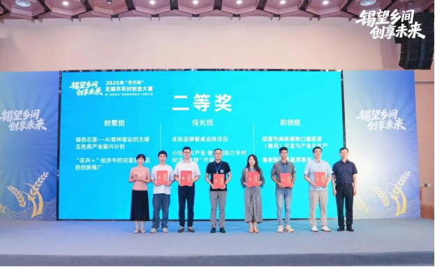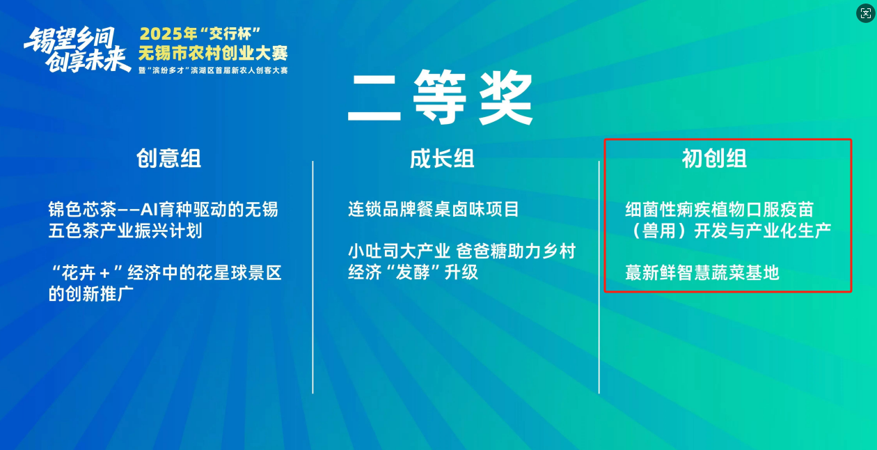 7月28日-7月29日,2025年“交行杯”无锡市农村创业大赛暨“滨纷多才”滨湖区首届新农人创客大赛在滨湖区胡埭镇成功举办,本届大赛覆盖农业农村全领域,设置创意组、初创组和成长组项目三个赛道,共有39个项目进入决赛路演环节。锡山台湾农民创业园江苏蔚农生物科技有限公司展示的《细菌性痢疾植物口服疫苗(兽用)开发与产业化生产》项目获得初创组二等奖。